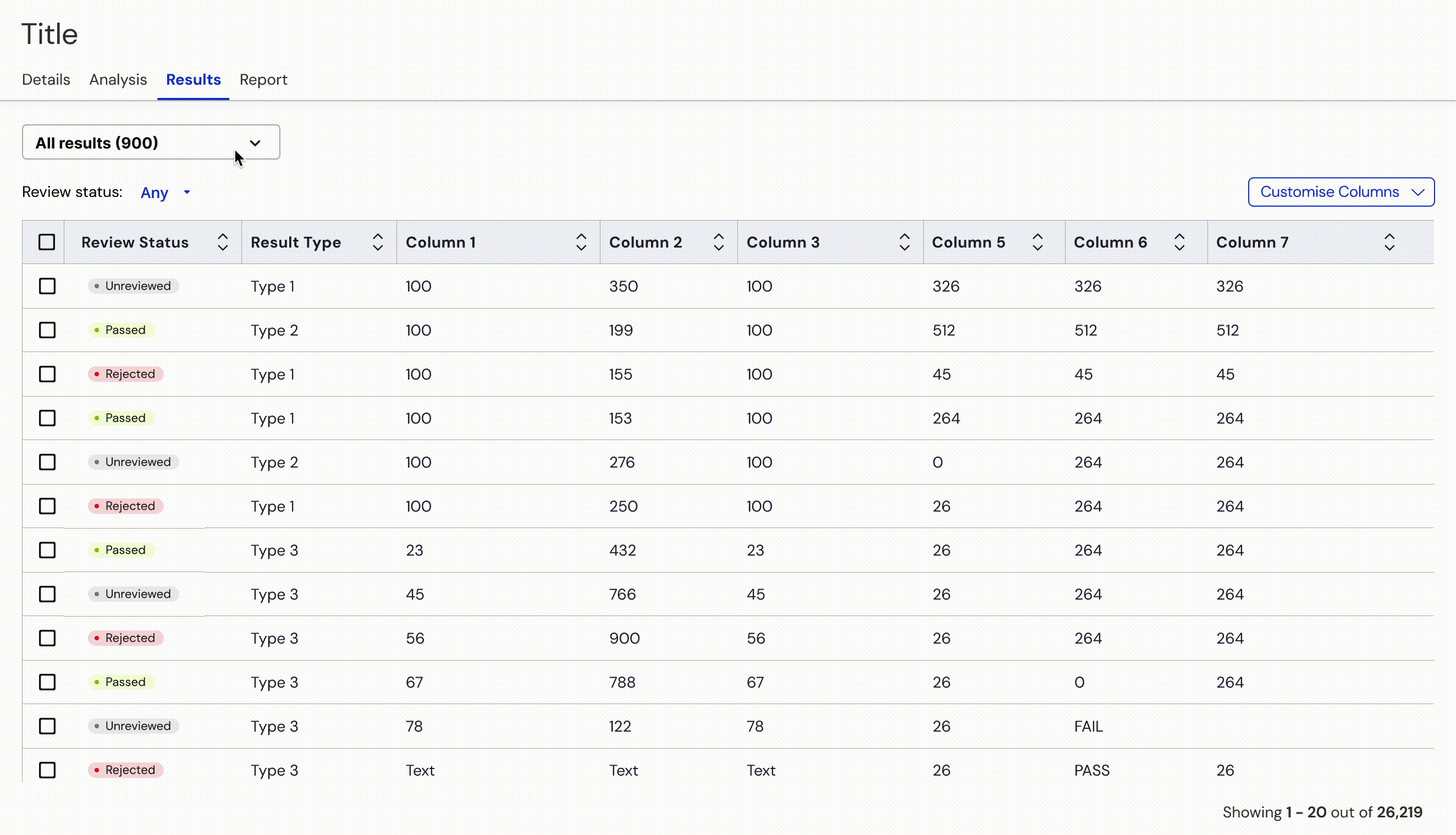 The wireframe below. To do a manual review, users had to select a query from the dropdown, use the review status filter above the table to filter out unreviewed results and perform the review.