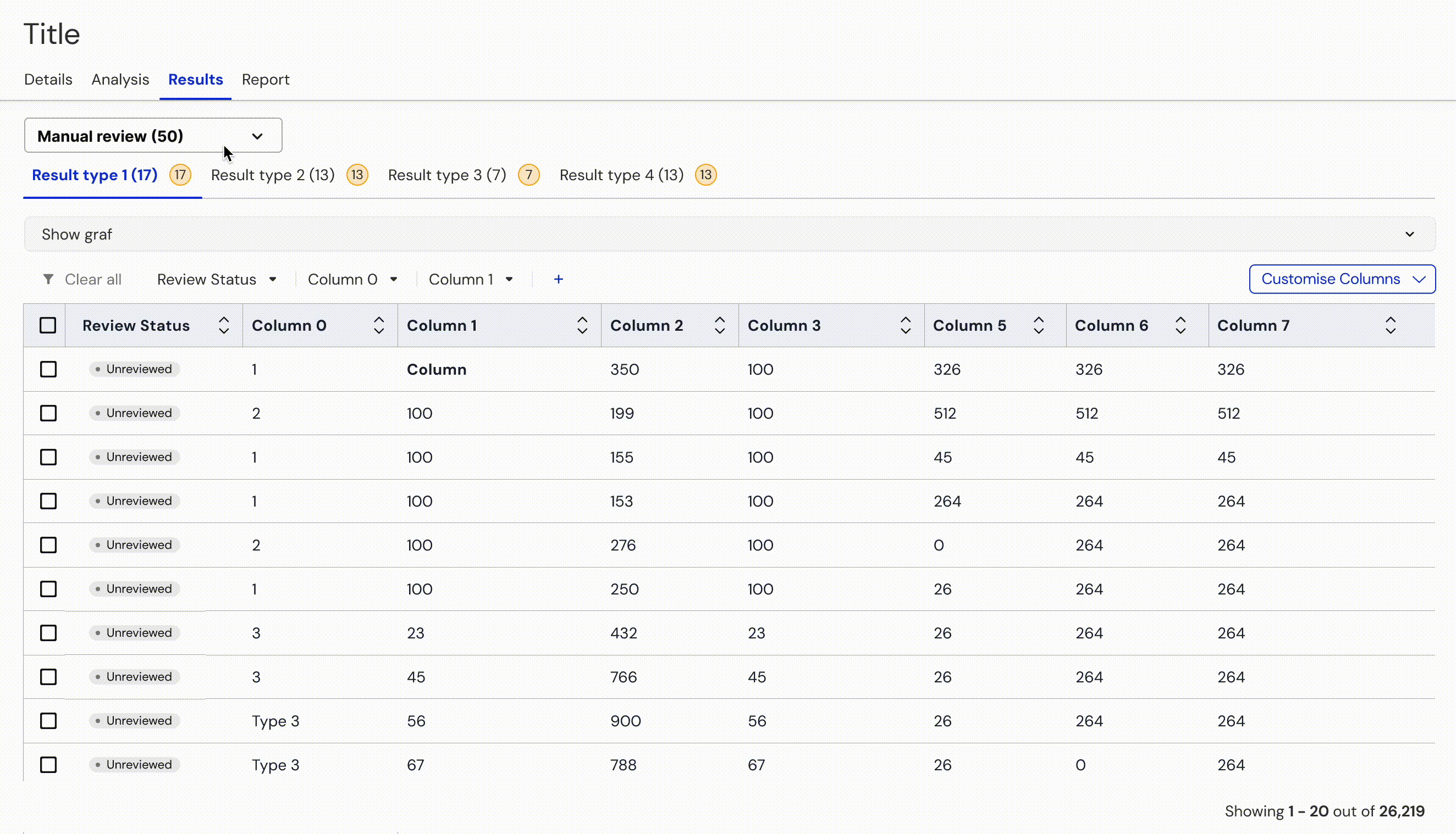 The first thing users should see is a manual review group of results, as we wanted to direct users to the most important thing they needed to do. Besides that, we could group results by type (represented with tabs in the UI) for easier review.